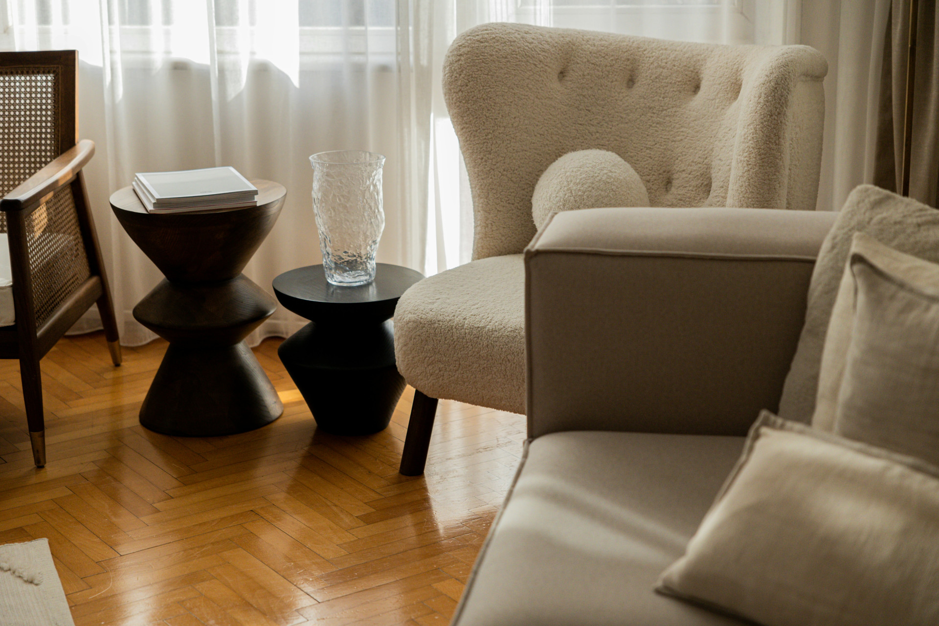 - Bouclé-stof i beige: Giver en blød og struktureret overflade med et moderne udtryk.
